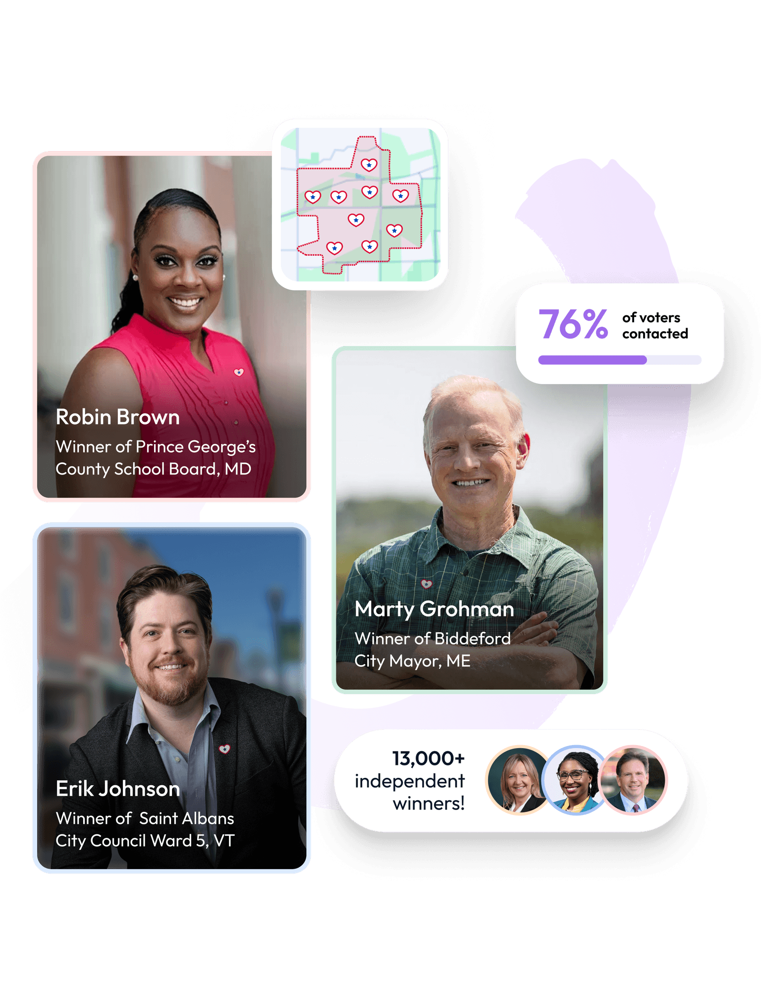 "Time management was huge for me. I have 6 children, and my husband works second shift. From the voter information, the support network in the group, all of your tools, the templates, the easy way that you can send out text messages, for way less than I thought it was going to be… There's just not a better deal out there. Without all of those tools put together, I would not be becoming the first female mayor of my city."