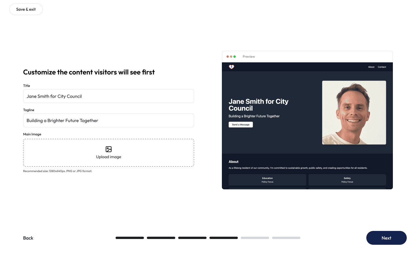 GoodParty.org’s website builder lets you assemble all four sections in under 15 minutes. First, you’ll customize your hero section: