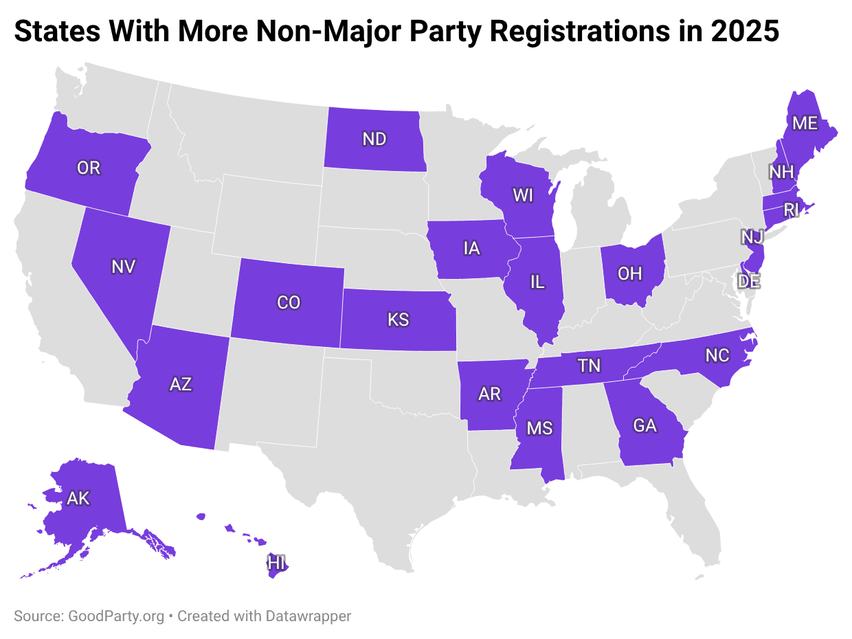 In 2025, 24 states recorded more new non-major-party registrations than new registrations with either major party.