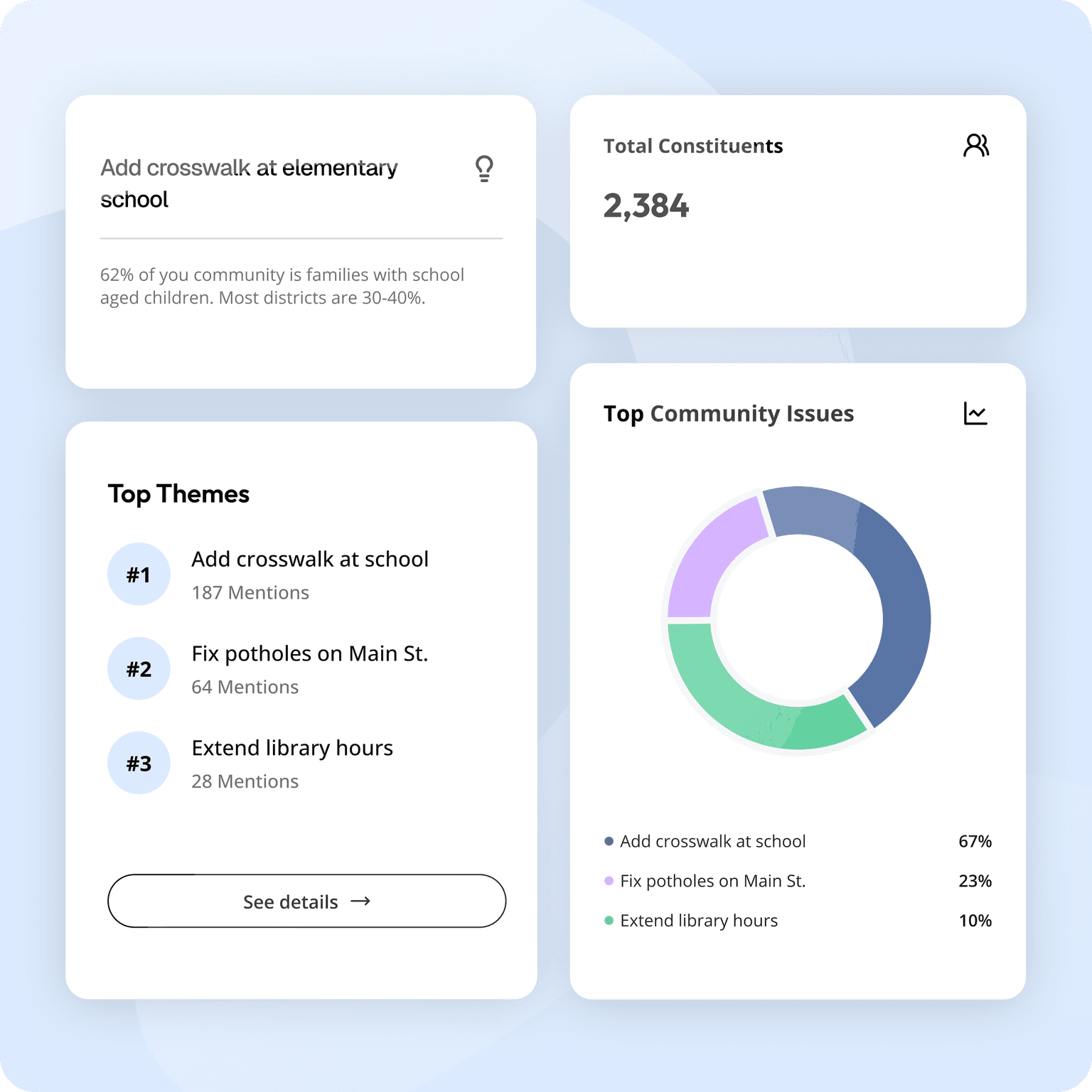 Keep constituents in the loop without hours of face-to-face conversations. Send updates, share results, and prove you're listening. All with one system.